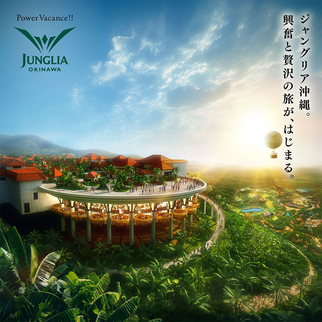 JUNGLIA OKINAWA(ジャングリア沖縄)は、神秘と生命力に満ちた世界自然遺産「やんばる」を擁する沖縄北部の圧倒的な大自然を舞台に、都会にはない興奮と贅沢の体験を通して沖縄の旅を変えるテーマパークです。コンセプトは、Power Vacance!!(パワーバカンス)。亜熱帯地域に位置する沖縄ならではの生命力に満ちた、見たこともない植物が生い茂るやんばるの大絶景を舞台に、その地にしかない体験を通して生まれる”興奮”と本物の自然に没入する”贅沢”が重なると、今まで経験したことのない”解放感”が人間の本能を貫き、人生最高に心が昂る“Power Vacance!!” を体験できます。